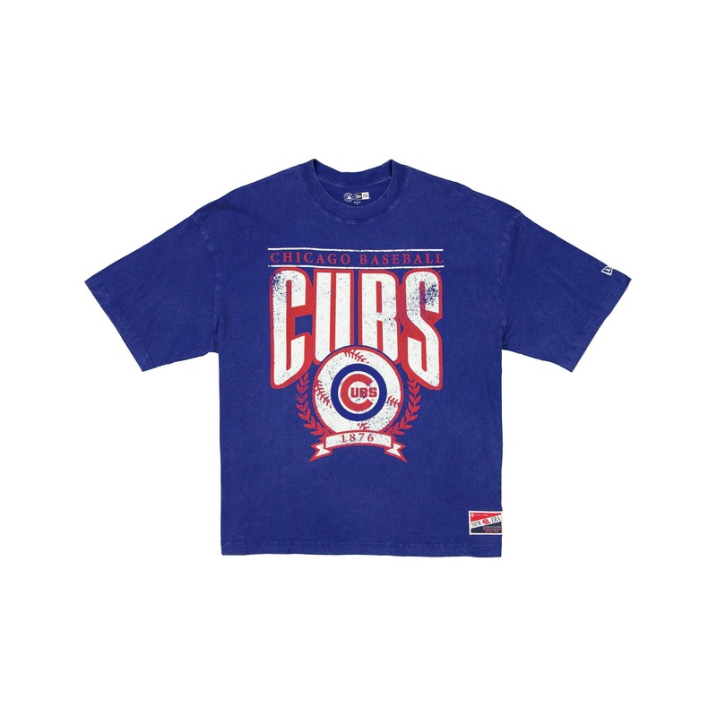 The Chicago Cubs Throwback Boxy T-Shirt features a screen-printed Cubs graphic at the front and a New Era jock tag at the left hip.