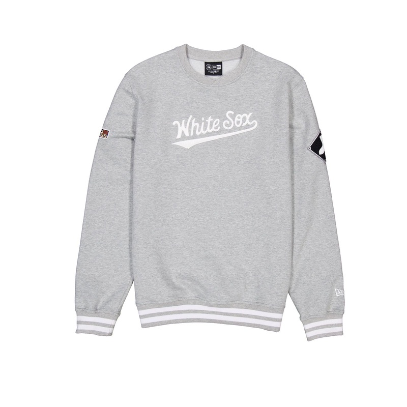 The Chicago White Sox Gray Logo Select Crewneck features an embroidered White Sox wordmark at the front panels with a matching team logo patch at the left arm and a 2005 World Series patch at the right arm.