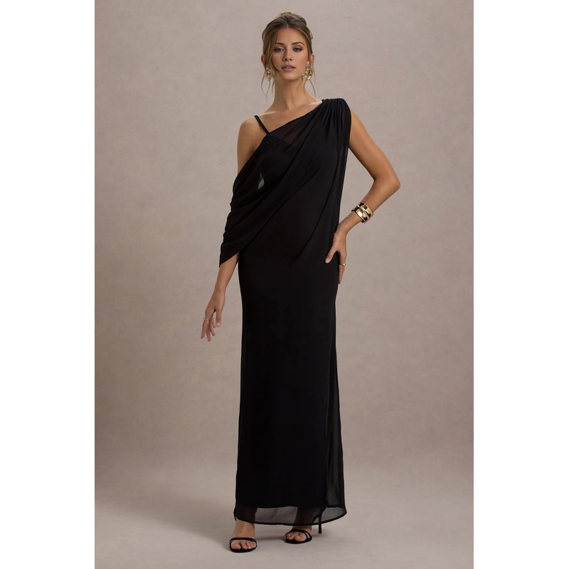- Premium woven fabric- Chiffon overlay- Asymmetric neckline- Adjustable cami straps- Invisible zip closure- Maxi length- Built-in bra