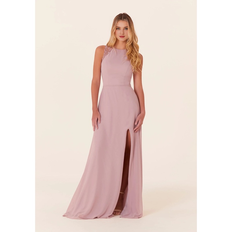 Chiffon sleeveless tight corset high neck lace up lock hole back bridesmaid dress