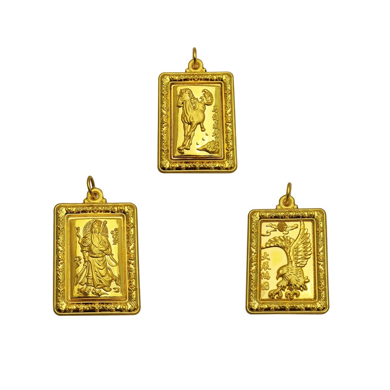 Precious Metal:24 Karat GoldHeight: 41.35mm*Width:24.60 mm*Approx. Weight:Guan Yu: ~7.70 grams*Horse: ~8.70 grams*Eagle: ~8.20 grams**All weights and measurements are approximate.**Necklace sold separately.Please contact us if you have further questions ab