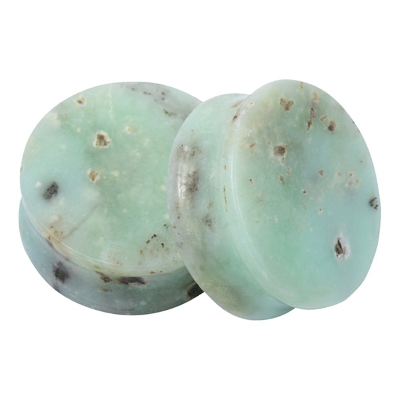 These double flare plugs are carved from Chrysoprase with a flat face on both sides and wearable area of 3/8" between flares. Each pair is unique and will differ from the product photo, but we can always send a pic of yours before shipping! Choose your siz