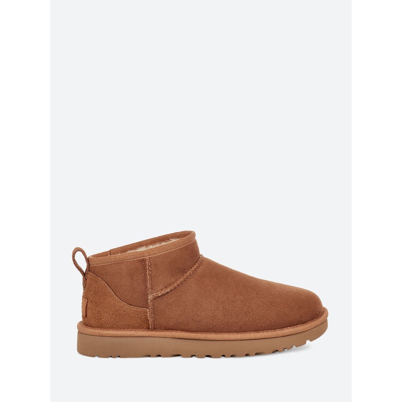 The Classic Ultra Mini updates UGG's most iconic silhouette with a lower shaft height, adding easy on-off and enhanced versatility.Ankle heightAsymmetrical toplineOverlock stitch detailing on seamsRear pull tabSuede heel counterLeather heel label with embo