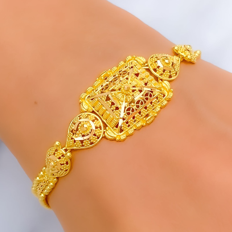 This refined 22K gold bracelet exudes sophistication with its sleek design and radiant yellow gold finish. Weighing 7.2 grams, it offers a perfect balance of elegance and durability. With a length of 7.25 inches and 0.7-inch adjustable links, it ensures a comfortable, secure fit. The hook lock closure enhances ease of wear while providing a reliable fastening. A timeless accessory that effortlessly complements any attire, making it an ideal choice for both daily wear and special occasions.