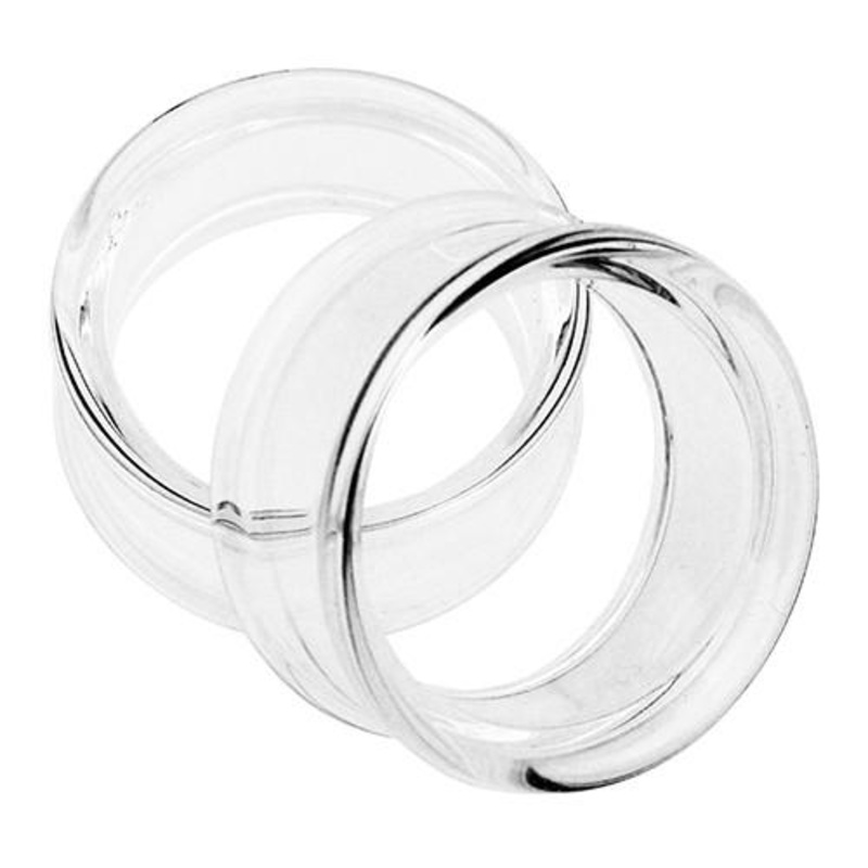 These double flare clear tunnels are made from hand blown borosilicate glass by Glasswear Studios. They have approximately 5/16" wearable area between the flares. Choose your size below.
