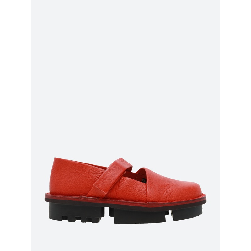 Trippen Closed Ahead minimalist slip-on shoe with an adjustable above the instep.Slip-on silhouetteAdjustable ankle strapRemovable cork footbedRound toeMaterialsUpper: leatherLining: leatherOutsole: rubberMade in GermanySize GuideStyle listed in European s