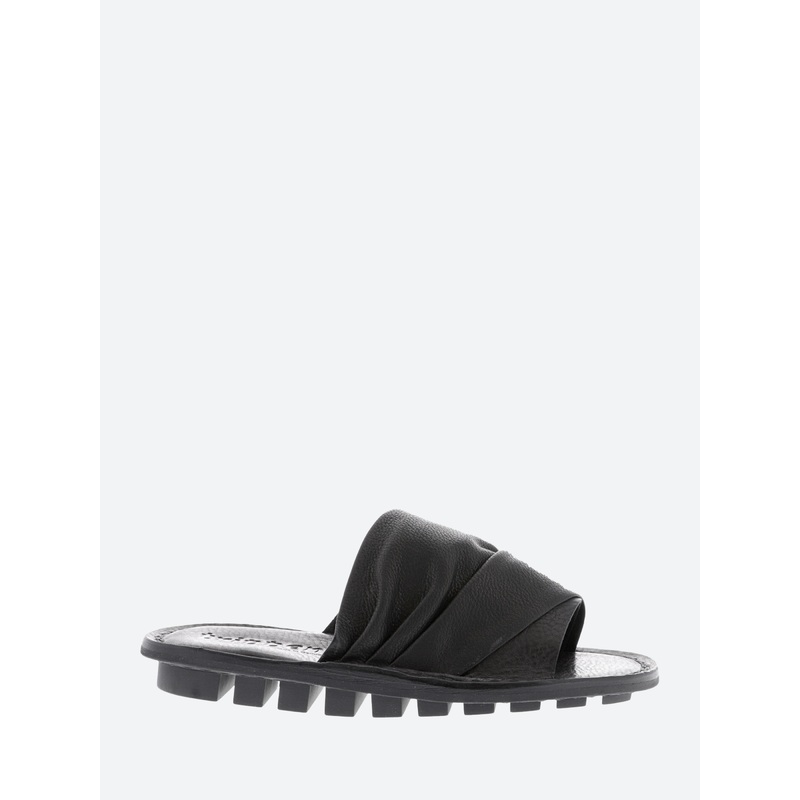 Two straps made of sturdier leather over the instep give support, while the placed strip made of softer leather forms gentle waves.Folded leather strapSlip-onCork footbedPerpendicular bars on the soleMaterialsUpper: leatherLining: leatherOutsole: rubberMad