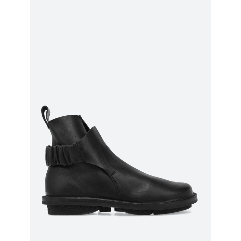 The front and heel sections of this ankle bootie are held together by a leather-covered elasticated strap over the heel.Ankle heightElasticated strap over the heelPull loop at the collarRemovable cork footbedRound toeMade in GermanyMaterialsUpper: leatherL