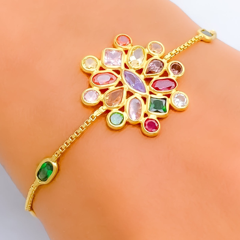 This 22k gold bracelet shines with a clustered adorned design, weighing 5.1 grams. The yellow gold finish amplifies the brilliance of the cubic zirconia stones, creating a luxurious and intricate appearance. Measuring 6.5 inches in length, it provides a secure and comfortable fit with its dependable S-lock clasp. Perfect for those who love bold yet elegant jewelry, this bracelet is a standout piece for any occasion.