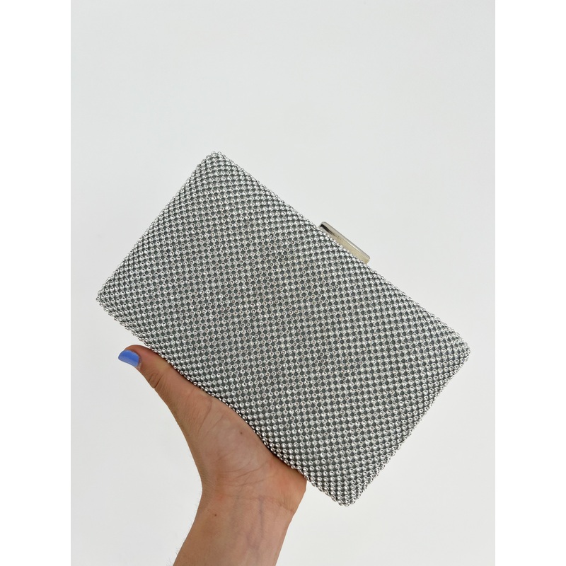 Bolso de mano con efecto brillo. Tiene una cadena extraible Cierre rectangular. Forma rectangularClutch para graduaciones, bodas y eventosMaterial: polisterMedidas: 20 cm de ancho y 13cm de alto. No se aceptan cambios ni devoluciones de este artculo