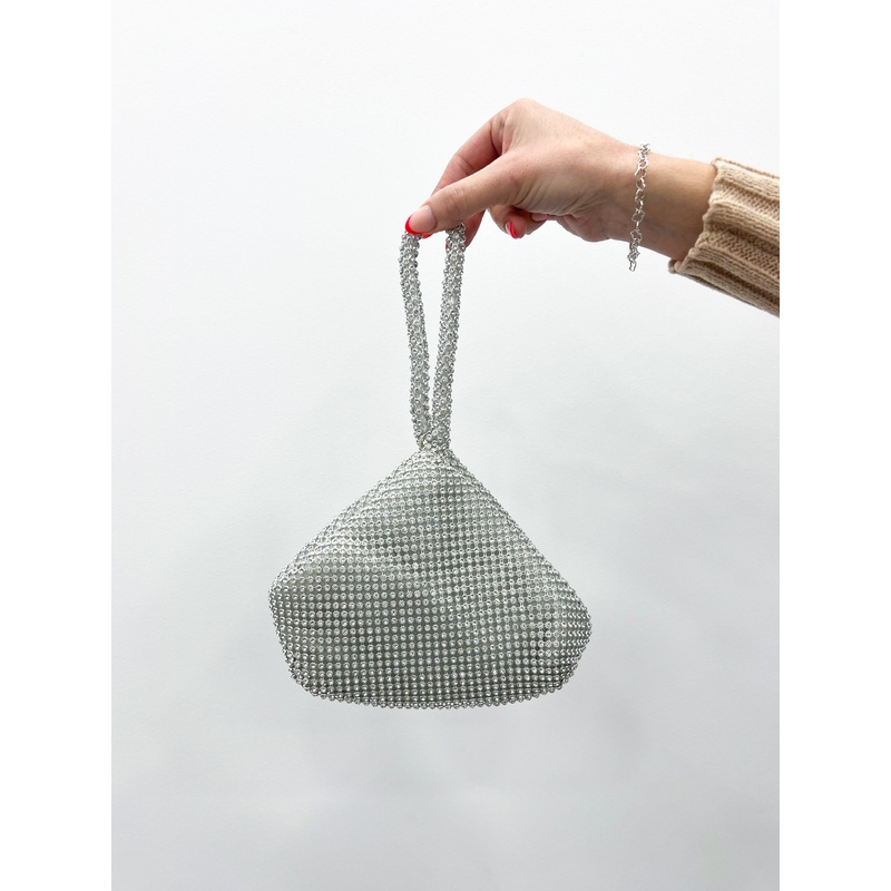 Bolso mini shopper con diseo de brillos y acabados plateados.