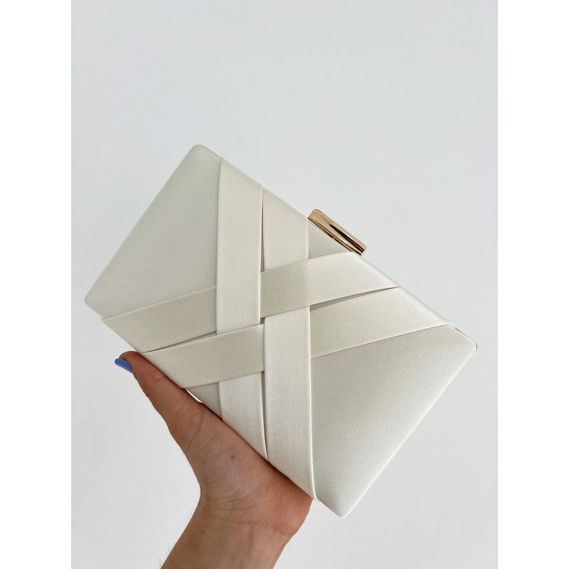 Bolso pequeo de mano satinado. Diseo con tiras entrelazadas. Acabados dorados. Tiene cadena extrable para llevarlo colgado. Forma horizontal.Clutch para graduaciones, bodas y eventosMaterial: PolisterMedidas: 20 cm de ancho y 13cm de alto. Este articulo es