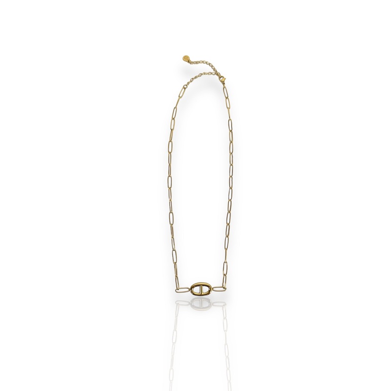 Collar de eslabones finos en dorado con eslabn grueso al centro.Altura regulable.Estn hechos de acero quirrgico. Este material no pierde el color y no es alrgico.Material: acero alergnicoEste articulo esta diseado y fabricado integramente en Europa e impor