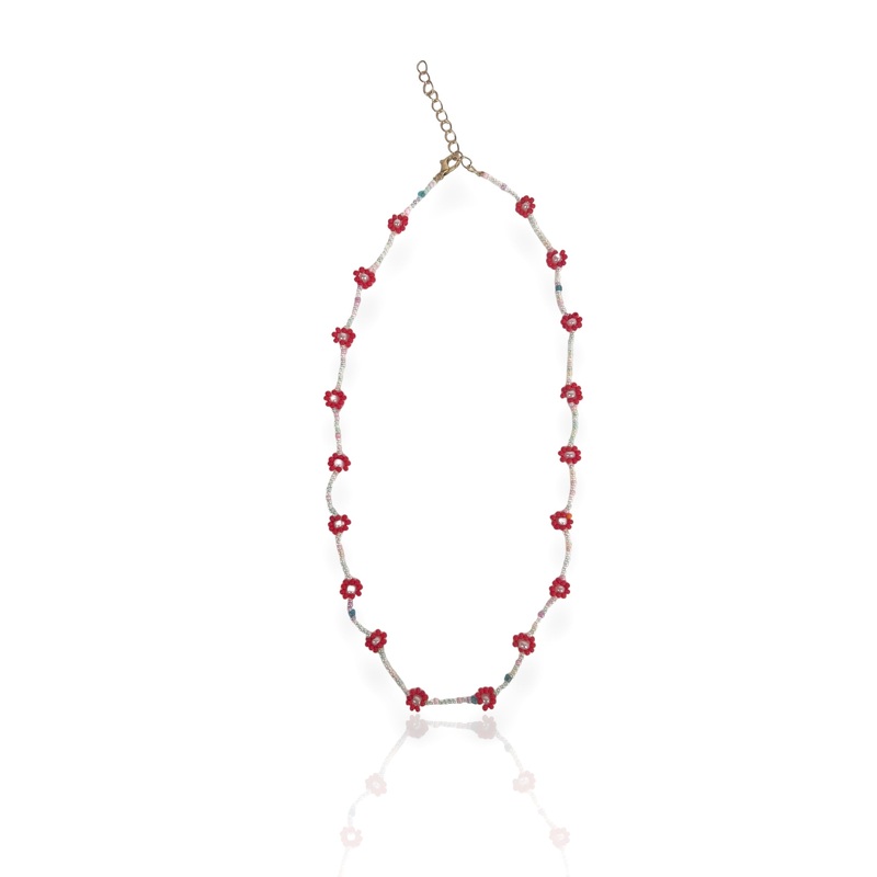 Collar de perlas rosas y blancas con flores rojas.
