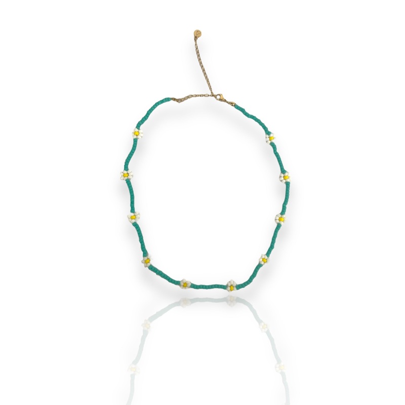 Collar de perlas turquesa con flores blancas.Cierre hecho de acero.Estn hechos de acero quirrgico. Este material no pierde el color y no es alrgico.Material: acero alergnicoEste articulo esta diseado y fabricado integramente en Europa e importado por Sorel