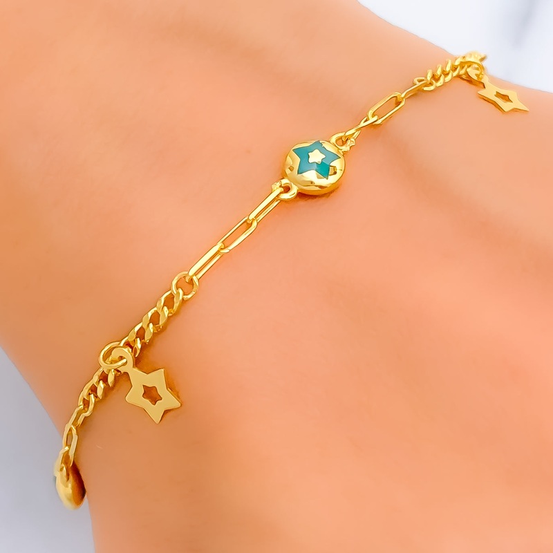 Vibrant and intricately designed, this 21k yellow gold bracelet showcases an ornate pattern that exudes charm and sophistication. Weighing 4.1 grams, its polished gold finish enhances the exquisite craftsmanship, creating a radiant and eye-catching appeal. Measuring 8.3 inches in length with 0.8-inch adjustable links, this bracelet ensures a comfortable and secure fit, fastened with a durable lobster lock. Designed for those who appreciate a blend of elegance and vibrant artistry, this exquisite piece is a stunning addition to any fine jewelry collection.
