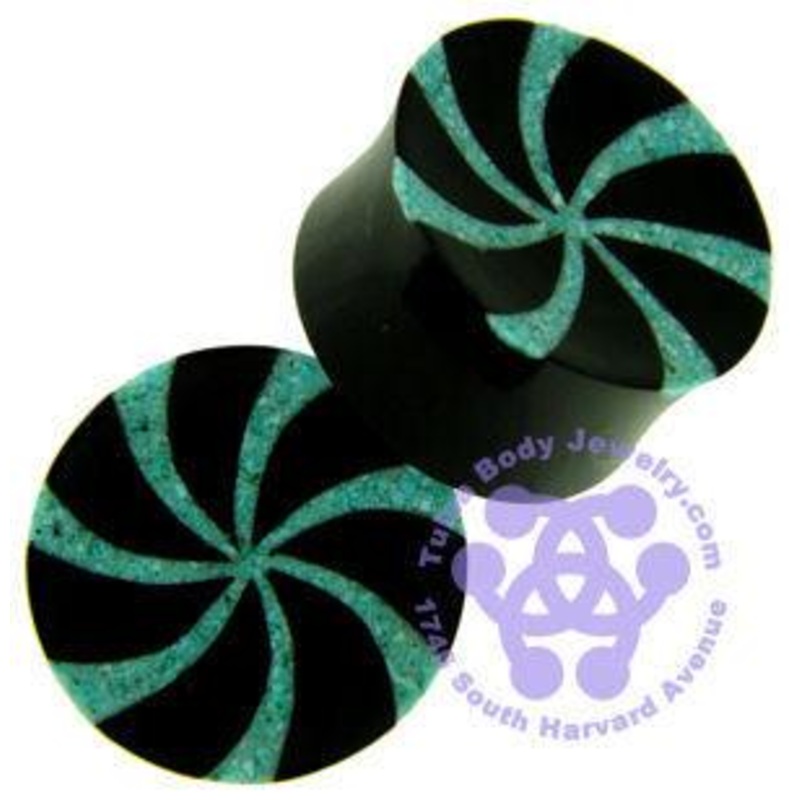 These concave double flare plugs are made from handcarved water buffalo horn with crushed turquoise inlay. Choose your size below.