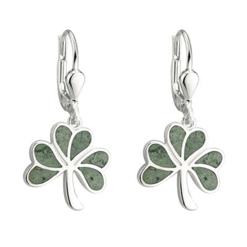 The shamrock is an iconic Irish emblem. Legend has it that it was plucked from the land by St Patrick to explain his belief in the Trinity. These beautiful dropearrings have been crafted in sterling silver and Connemara marble, a stone dating back to ancie