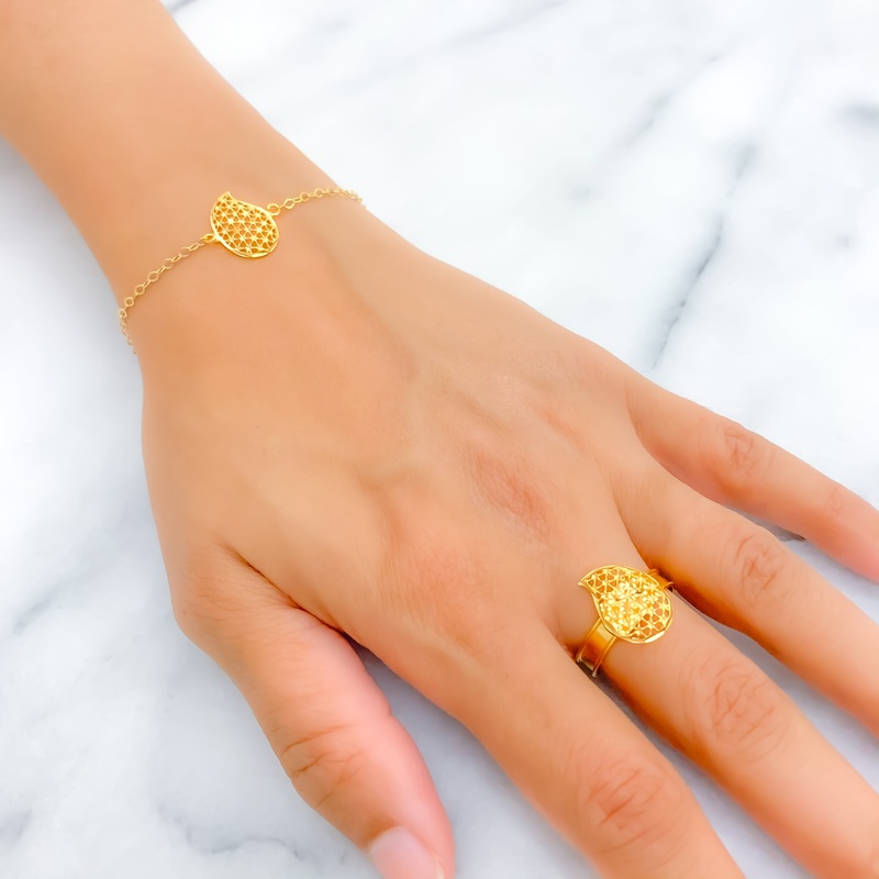 This 21k gold bracelet and ring set, weighing 3.9 grams, features a captivating contour netted paisley design that exudes elegance and sophistication. The yellow gold finish enhances its luxurious and radiant appearance. The bracelet measures 7.25 inches i