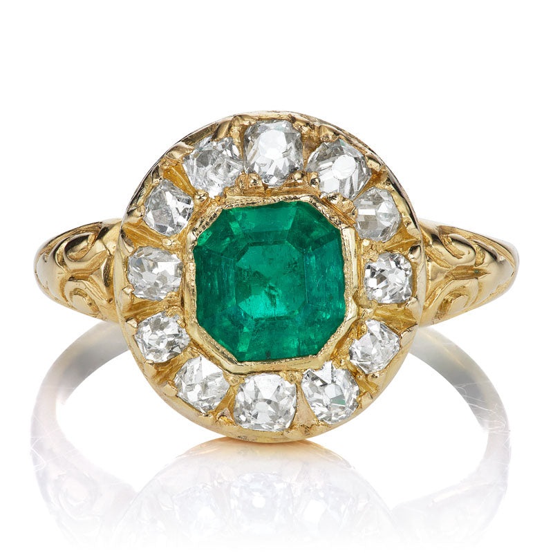 TheCosette ring is an authentic vintage emerald and diamond ring from the Victorian Era circa 1890.The ring centers a GIA-certified Octagonal Step Cut Colombian Emerald of moderate clarity enhancement weighing approximately 1.20-carats.Surrounding the center stone is a halo of 12 Old Mine Cut diamonds of approximately I-J color, VS-I clarity combining for roughly 0.60-carats. The stones are set in an 18kt yellow gold engraved setting. The ring is currently size7.75and can be resized!
