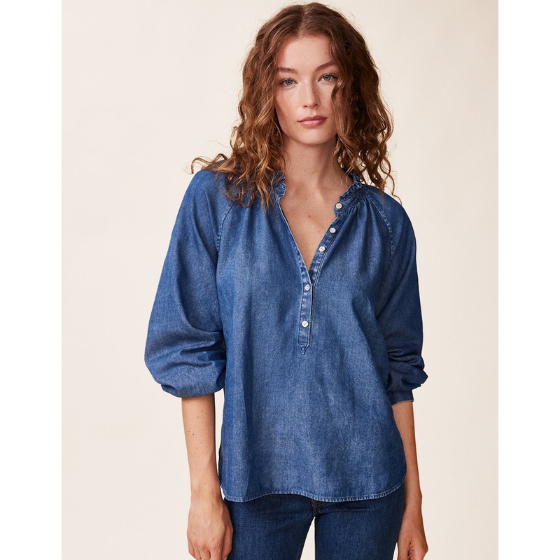 inspired by the classic denim shirt, with a feminine twist. the ruffle blouse is made from cotton chambray for a lightweight, comfortable fit.half-placket with akoya-shell buttonsraglan sleevesmedium-dark washstyle id: 1201-1835-532