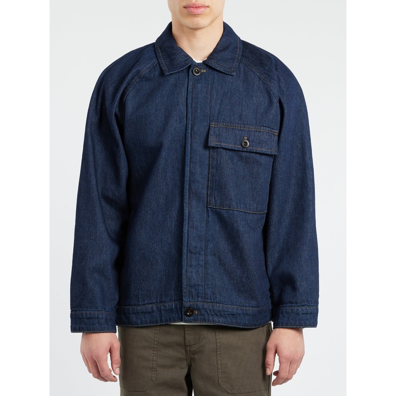 TOAST indigo denim jacket is accented by contrasting topstitching. With volume through the body, it is made from hemp a durable cotton and hemp, which has a rustic and textured quality.