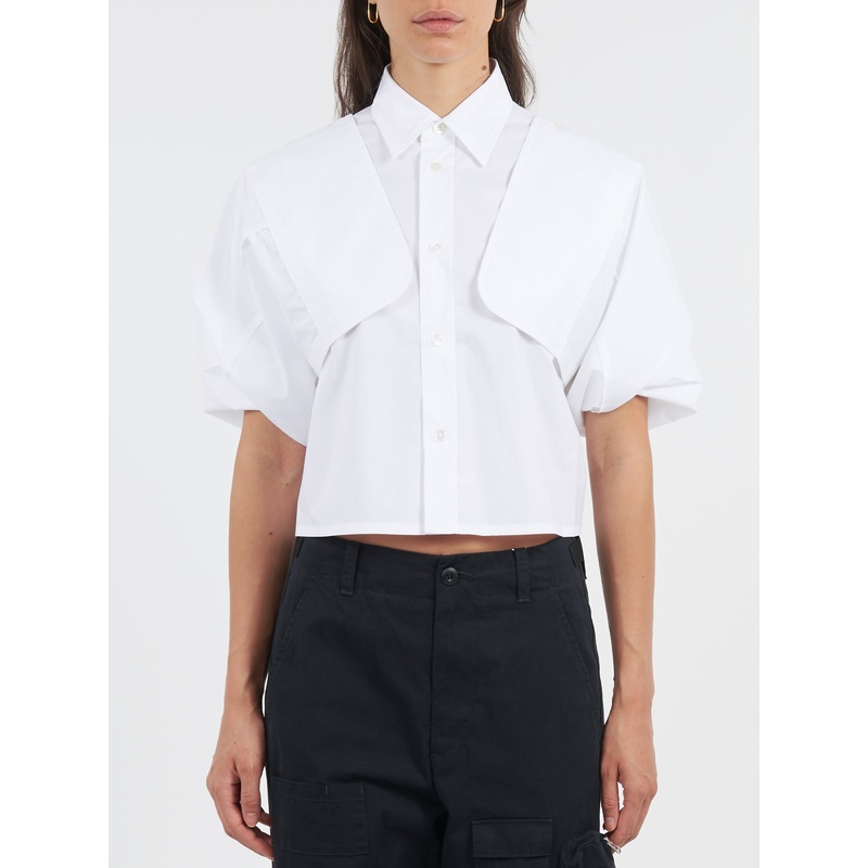 A versatile wardrobe staple, this shirt is cut from cotton poplin and tailored to a classic yet cropped silhouette with wide sleeves and a patch pocket. MM6s discreet yet distinct signature, a horizontal line of white stitches, is found on the back.Point c