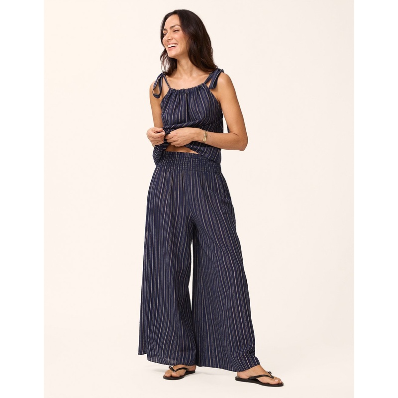 the easiest pants you'll ever wear. we designed these beach pants with a relaxed, flowy fit that makes for effortless layering over swimwear. they're cut from cotton with woven lurex stripes throughout for a hint of sparkle.smocked waistlurex stripesmake i