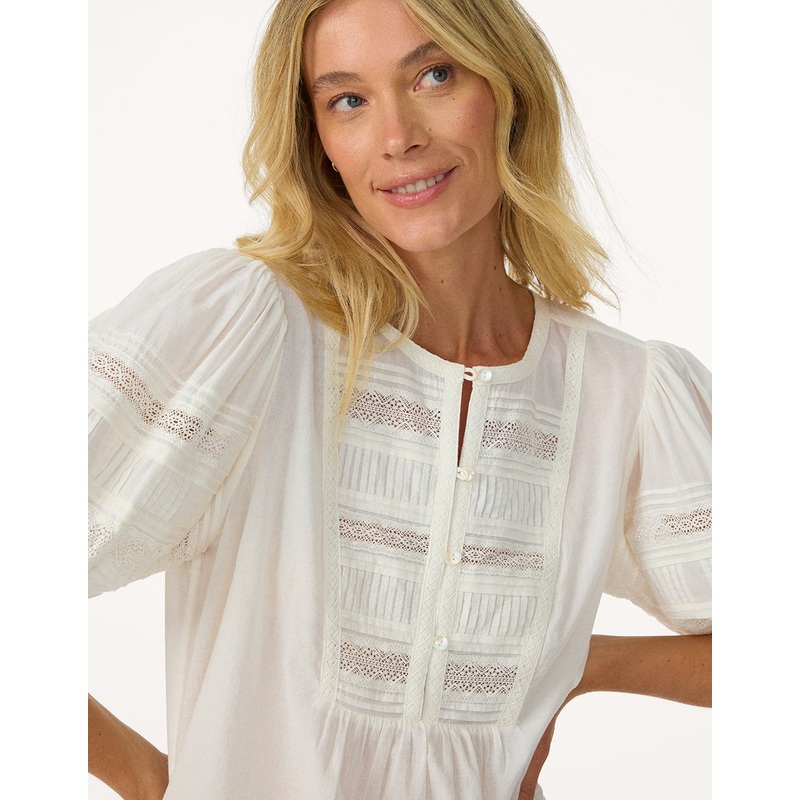 classic elegance at its finest. we designed this cotton blouse with pintuck and lace detailing so it's both understated and elevated.pintuck and lace detailsbutton-up bibabove-the-elbow puff sleeveskeyhole closures on cuffsakoya-shell buttonsstyle id: 1201