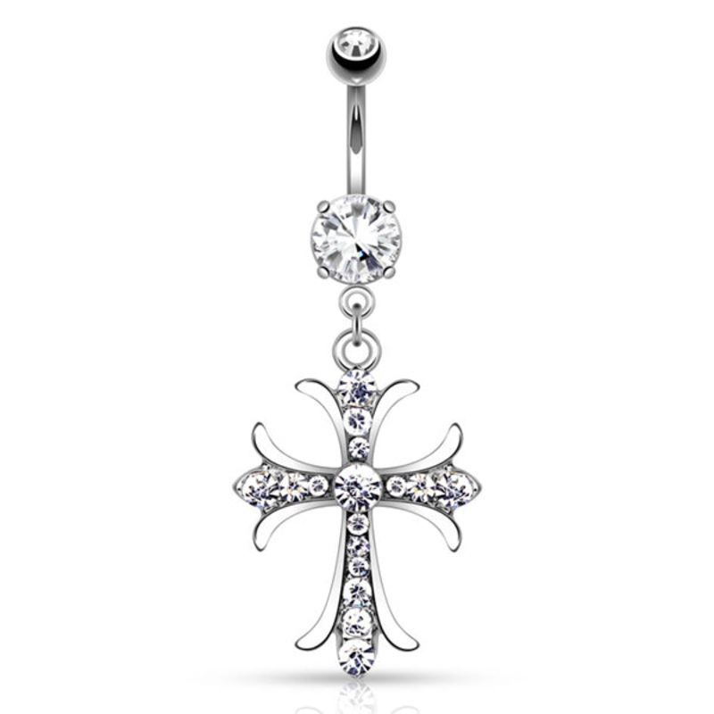 The 14 gauge cross cz belly dangle is made from 316L stainless steel with external threading. Only the 5mm top ball is removable.
