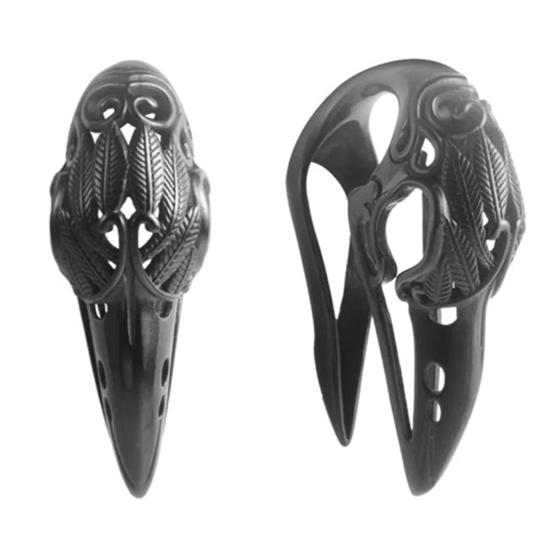 These carved crow skull hangers are cast from black PVD coated 316L surgical grade stainless steel. They fit stretched ear lobes sized 1/2" or larger. These can be difficult to insert if you don't wear double flared jewelry in your stated size. These are a