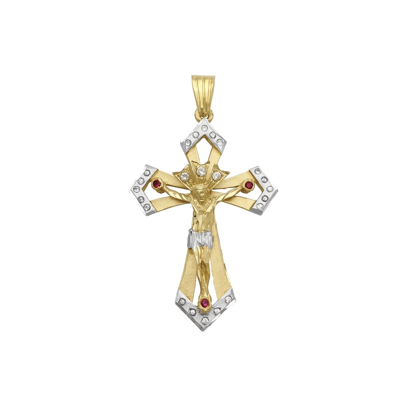 Precious Metal: 14 Karat Two-TonedGold(Yellow Gold and White Gold)Gemstones: Cubic ZirconiaRound Shaped: White and RedStones may be upgraded upon request.Height: 71.33 mm* (2.81 inch)Width: 41.20 mm* (1.62 inch)Thickness: 7.98 mm*Approx. Weight: ~18.1 gram