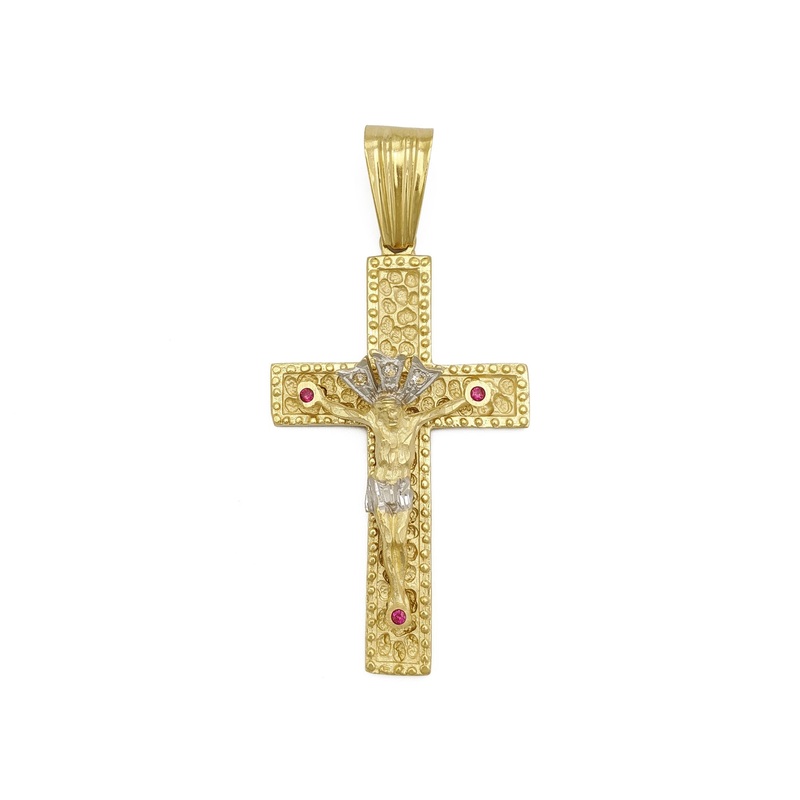 Precious Metal: 14 Karat Two-Toned Gold (Yellow and White)Gemstones:Cubic ZirconiaRound Shaped:RedStones may be upgraded upon requestHeight: 82.35 mm* (3.24 inch)Width: 39.08 mm*(1.54 inch)Thickness: 9.45 mm*Approx. Weight: ~23.1 grams**All weights and mea
