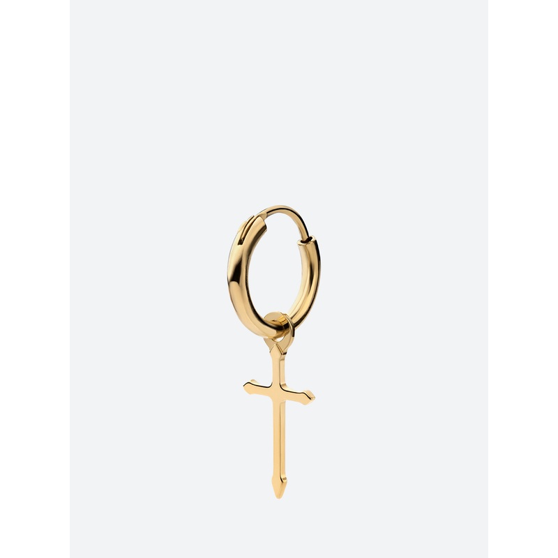 Miansai Crux Huggie features a round hoop with a single cross floating from the bottom. Crafted in gold vermeil, this singular earring adds a touch of cool to a modernized classic.