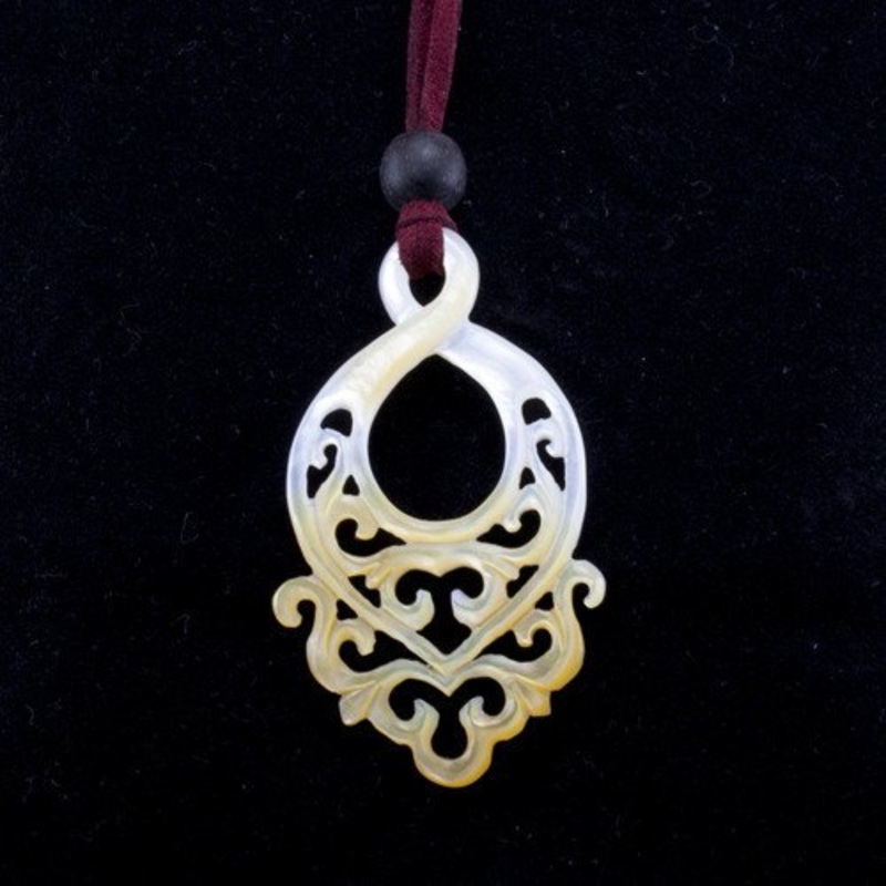 This well crafted hand-carved mother of pearl pendant was inspired by the movement and elegance of a crystal chandelier. This beautiful piece is perfect for any engagement, whether dressing up or casual. Pendant comes with a red adjustable strap, and black