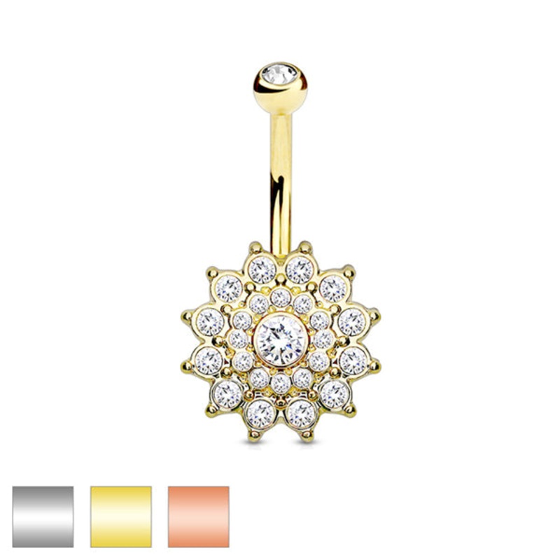 The 14 gauge crystal dahlia belly ringis made from 316L stainless steel with external threading. Only the 5mm ballend is removable. Choose your metal finish and gem color below.