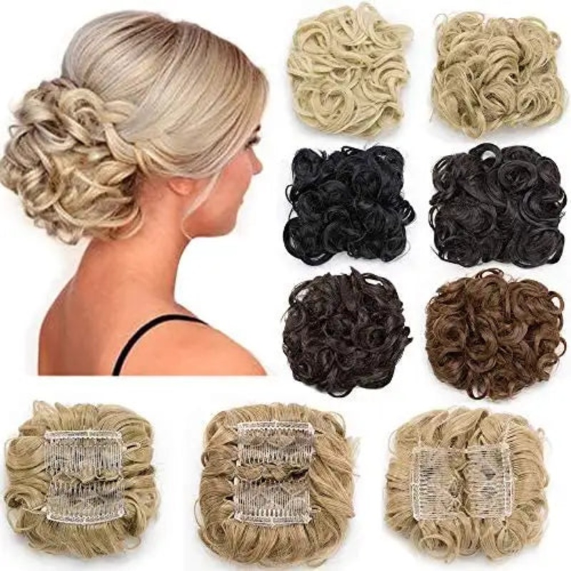 Curly Synthetic Fibre Clip in Hairpiece ChignonColorShown:24T613Net Weight:90GSize: 5.5 x 5.5 inch MATERIAL: 100% Japanese A class heat-resisting fibres high quality kanekalon fibre, well blending with your own hair, which looks like real human hair Combs