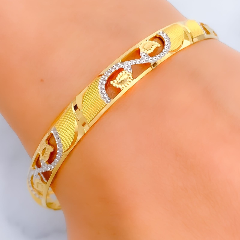 This 22k gold bangle, with a weight of 13.4 grams, showcases exquisite curved cutwork in a leaf motif, combining yellow and white gold for a stunning visual effect. The intricate design mirrors the natural elegance of leaves, adding a dimensional beauty to