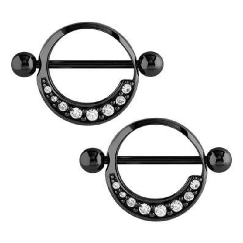These 14 gauge cz nipple shields are made from black PVD coated 316L stainless steel with an interior diameter of 9/16". The 14g 3/4" straight barbells are made from blackline 316L stainless steel with external threading. The gems are available in clear on