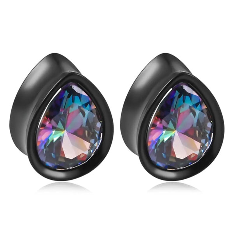 These double flare cz teardrop plugs are made from black PVD coated 316L stainless steel. The CZ is available in Vitrail Medium color only. Choose your size below.