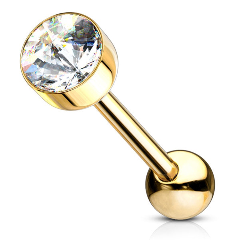 The 14 gauge tongue barbell is made from gold PVD coated 316L stainless steel with external threading. The cz is available in clear only.