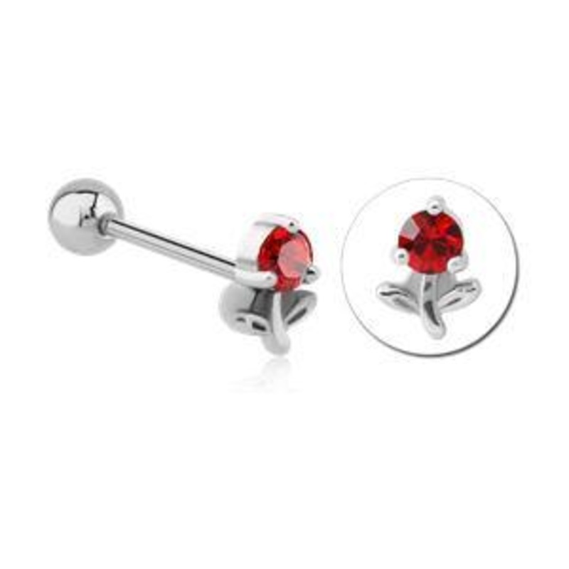 The cz flower tongue ring is made from 316L stainless steel with external threading. The 14 gauge barbell is 5/8" long. The gem is available in red only.