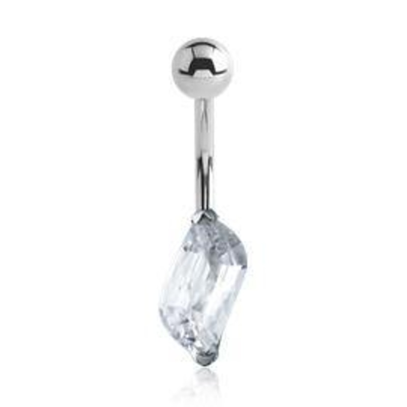 The 14 gauge cz leaf belly ring is made entirely from 316L stainless steel with external threading. The 6x12mm gem is available in clear only.