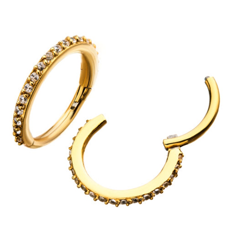The 16 gauge cz paved hinged segment ring is made from gold PVD coated 316L stainless steel. These look just like a regular segment ring, but so much easier to use (no ring openers are required). The cz gems are available in clear only. Choose your size be