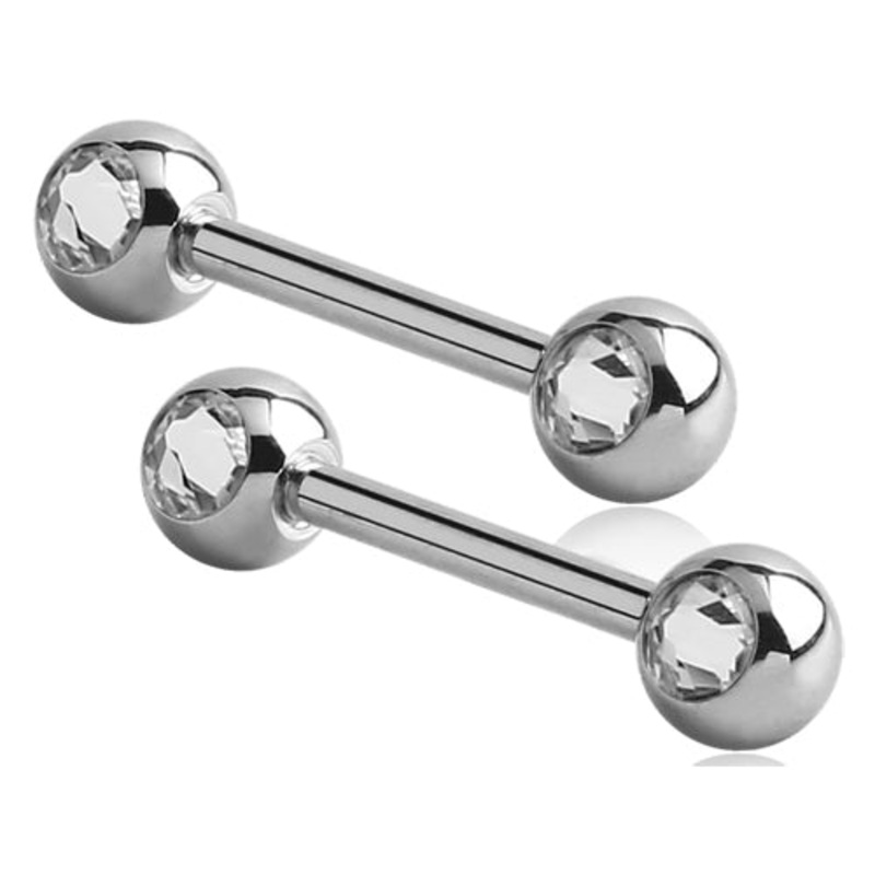 The 14 gauge nipple barbells are made from 316L stainless steel with external threading. The cz gems are available in clear only. Choose your barbell size below.