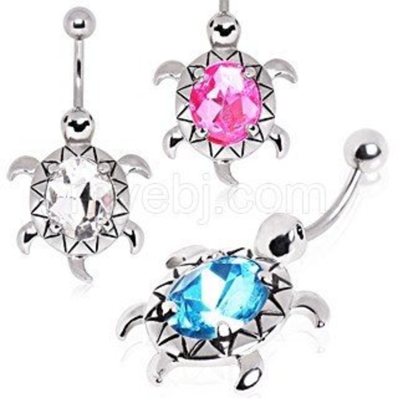 The 14 gauge cz turtle belly ring is made from externally threaded 316L stainless steel. Only the 5mm ball end is removable. AVailable with the clear gem only.