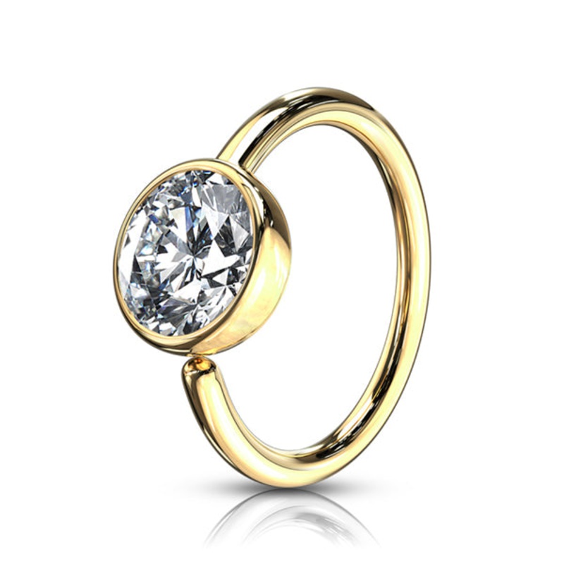 The 20 gauge nose hoop is made from solid yellow 14k gold. The 4mm bezel-set faceted gem is available in clear only. If you're unsure how to open and close continuous rings (a.k.a. seamless), be sure to check out our video demonstration.