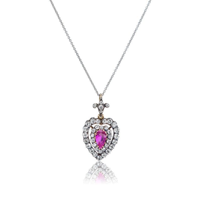 No-Heat Burma Pear Cut Ruby in Heart Shaped Diamond PendantThe Dahlia necklace is an antique diamond and ruby necklace. This necklace centers a GCS Certified 1.30 carat Pear Shaped No-Heat Burma Ruby. Surrounding the Ruby are 33 Old Cut diamonds of H-I col