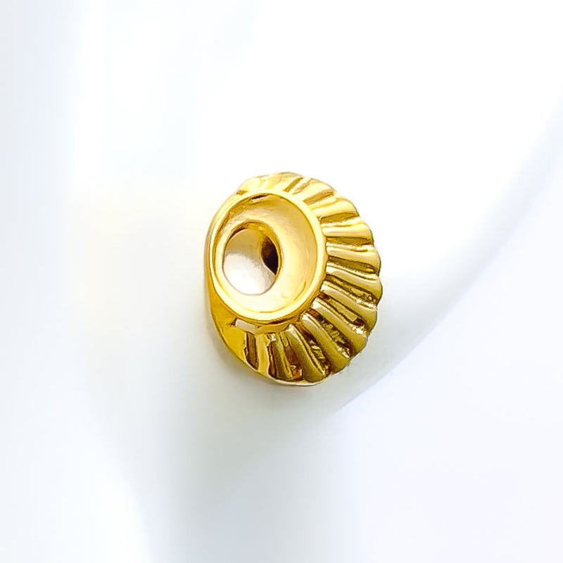 These 22k gold top earrings, weighing 2.3 grams, feature a refined decorative design that exudes understated elegance. The polished yellow gold finish enhances their intricate detailing, while the 0.4-inch length offers a graceful and subtle accent. Design