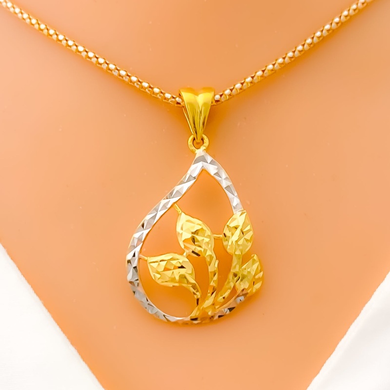 Embrace your delicate side with our Dainty Ethereal 22K Gold Pendant. Weighing 2.5 grams, this pendant features a stunning combination of yellow and white gold finishes. The intricate 1.25″ design exudes grace and sophistication. Chain not included. Elevate your style with this ethereal piece.